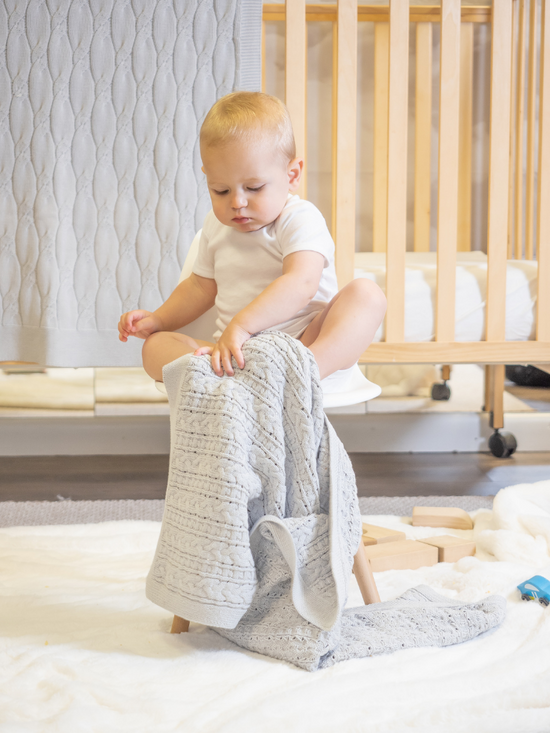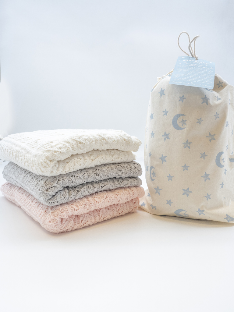 All blankets come wrapped in a cute, organic cotton bag that is intended to be used as wrapping paper. Just tuck the blue tag inside the bag, add your card, and it’s ready to go! The bag can be reused for toys or anything else; it’s also machine washable.